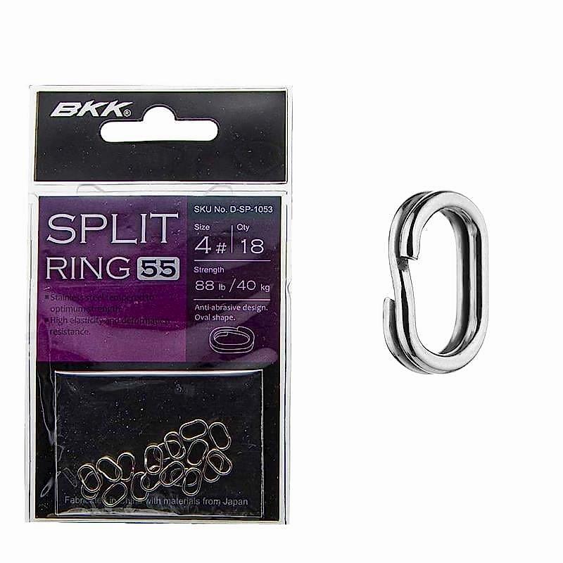 BKK Split Ring-55, tekli veya üçlü kancanın yem gövdesinden daha uzakta kalmasına olanak tanıyan oval bir şekil ile tasarlanmıştır ve belirli balıkçılık koşullarında daha sağlam bağlantılara olanak tanır. Paslanmaz çelik malzeme, temperleme ve ince kimyasal cilalama, bölünmüş halkaların kalitesini garanti eder.